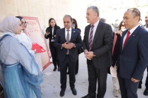 وجال الأحمد يرافقه مدير المركز الثقافي الصيني في عمان تشاو تشيانغ، والمدير العام للمركز الوطني للثقافة والفنون لينا التل، على المعروضات، مبدياً إعجابه بالمعروضات لاسيما تلك التي تمثل الصناعات الحرفية الثقافية الإبداعية الصينية.