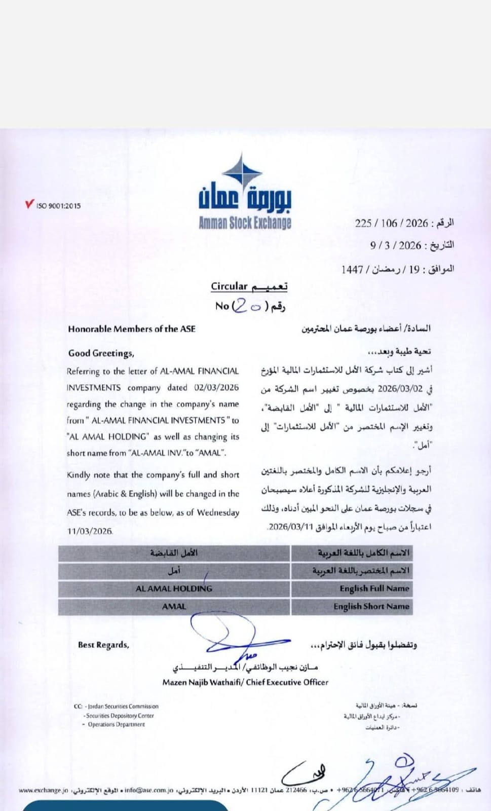 الرقم نيوز-أشارت بورصة عمان في تعميم لها، الى تغيير شركة الامل من “الامل للاستثمارت المالية” الى “الامل القابضة” وتغيير الاسم اامختصر من “الامل” الى “الامل”.