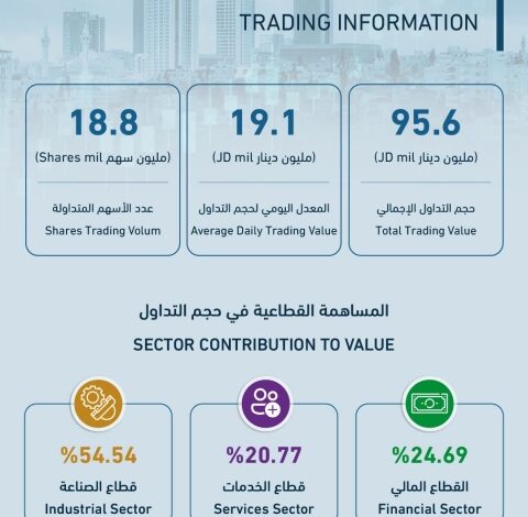 وسجلت شركات “مساكن الأردن لتطوير الأراضي والمشاريع الصناعية” و”المعاصرون للمشاريع الإسكانية” و”بنك الاستثمار العربي الأردني” و”العربية الدولية للتعليم والاستثمار” و”التجمعات الاستثمارية المتخصصة” أعلى الارتفاعات، فيما سجلت شركات “كهرباء محافظة إربد” و”السلام الدولية للنقل والتجارة” و”الاستثمارية القابضة للمغتربين الأردنيين” و”الأردنية لتجهيز وتسويق الدواجن ومنتجاتها” و”السنابل الدولية للاستثمارات الإسلامية (القابضة)” أكبر الانخفاضات خلال الأسبوع.