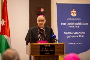 وجاء افتتاح هذه الورشة، بحضور رئيس لجنة السياحة والتراث في مجلس الأعيان العين ميشيل نزال، والنائب البطريركي للاتين في الأردن المطران إياد الطوال، ورئيس جمعية أدلاء السياح أيمن عمر، وممثلين عن مجلس رؤساء الكنائس في الأردن كل من الأرشمندريت فينيذكتوس كيال، والقس الارشديكن فائق حداد، ورئيس جمعية الأرض المقدسة “ترسنطا” طارق رزق الله.